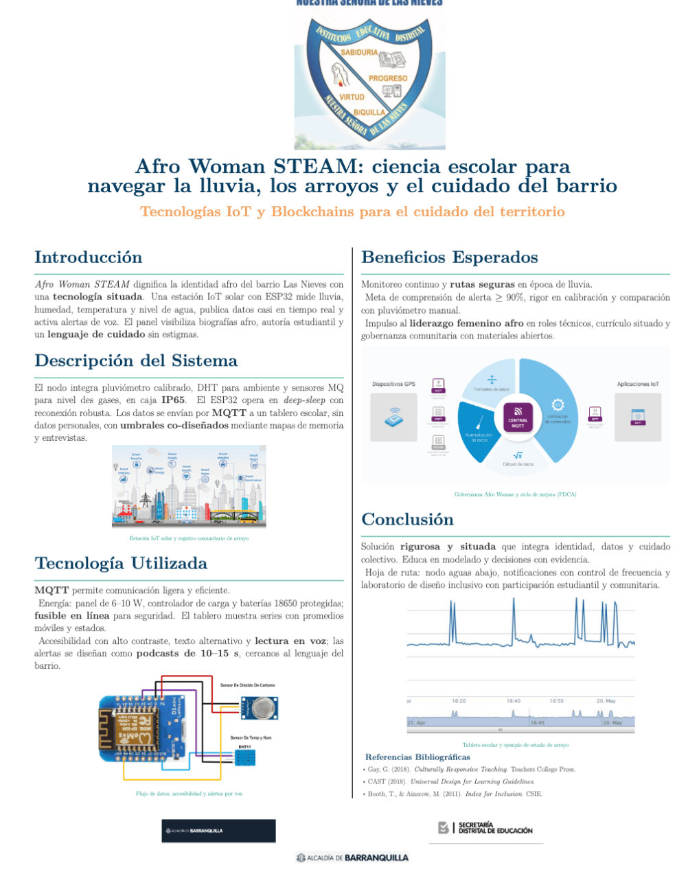 Afro Woman STEAM integra una estación IoT solar basada en ESP32 para el monitoreo de lluvia, humedad, temperatura y niveles de agua en arroyos cercanos al barrio Las Nieves. Los datos recolectados se visualizan en un tablero escolar accesible, acompañado de alertas por voz diseñadas con lenguaje cercano a la comunidad, fortaleciendo la prevención y el autocuidado en temporada de lluvias.
